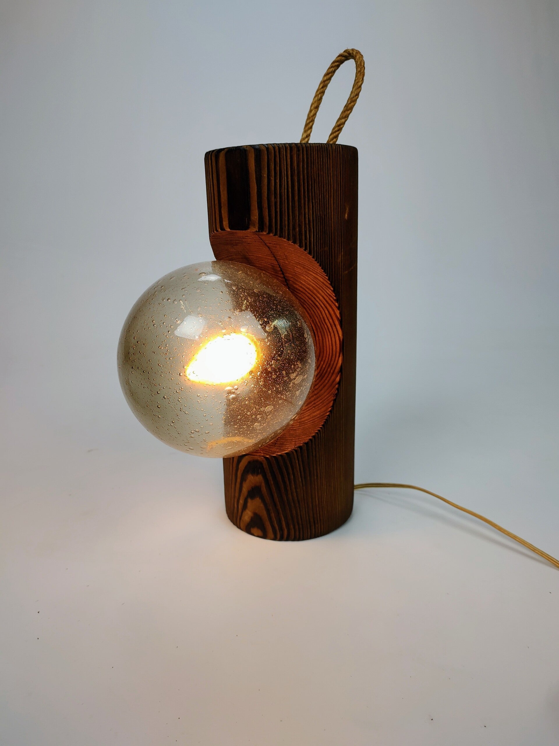 Robust brutalist wood and glass lamp. Can be used on the wall or as table lamp.