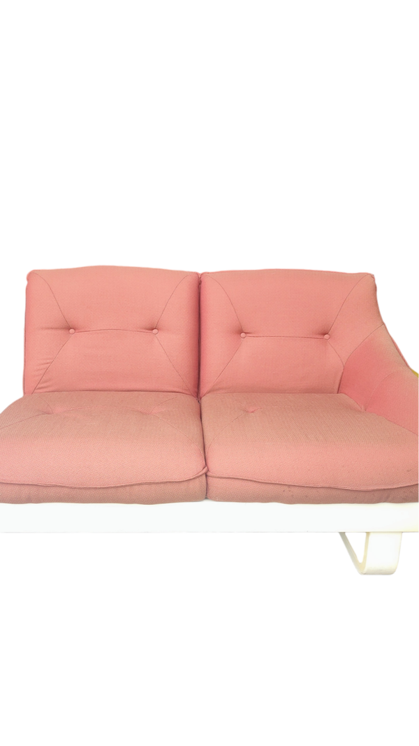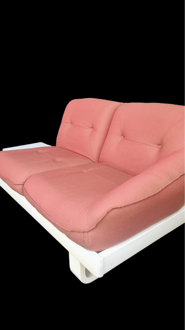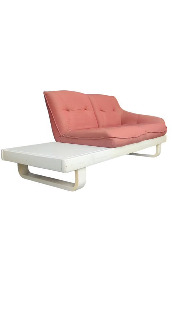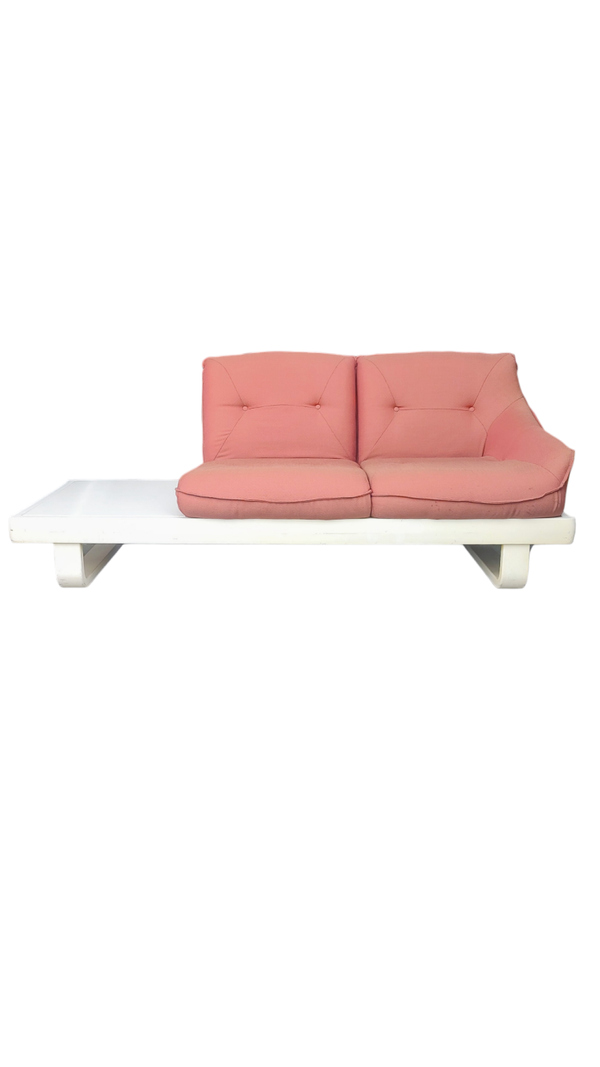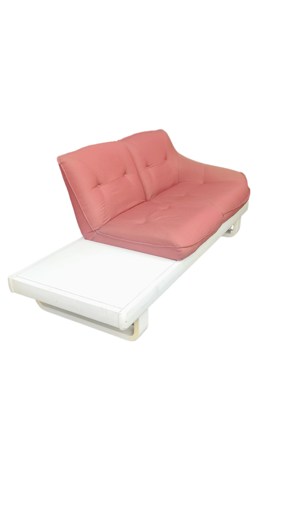 Very funky two-seater sofa on wooden base with table-space and two seats. Original mixed coloured fabric still in very good condition