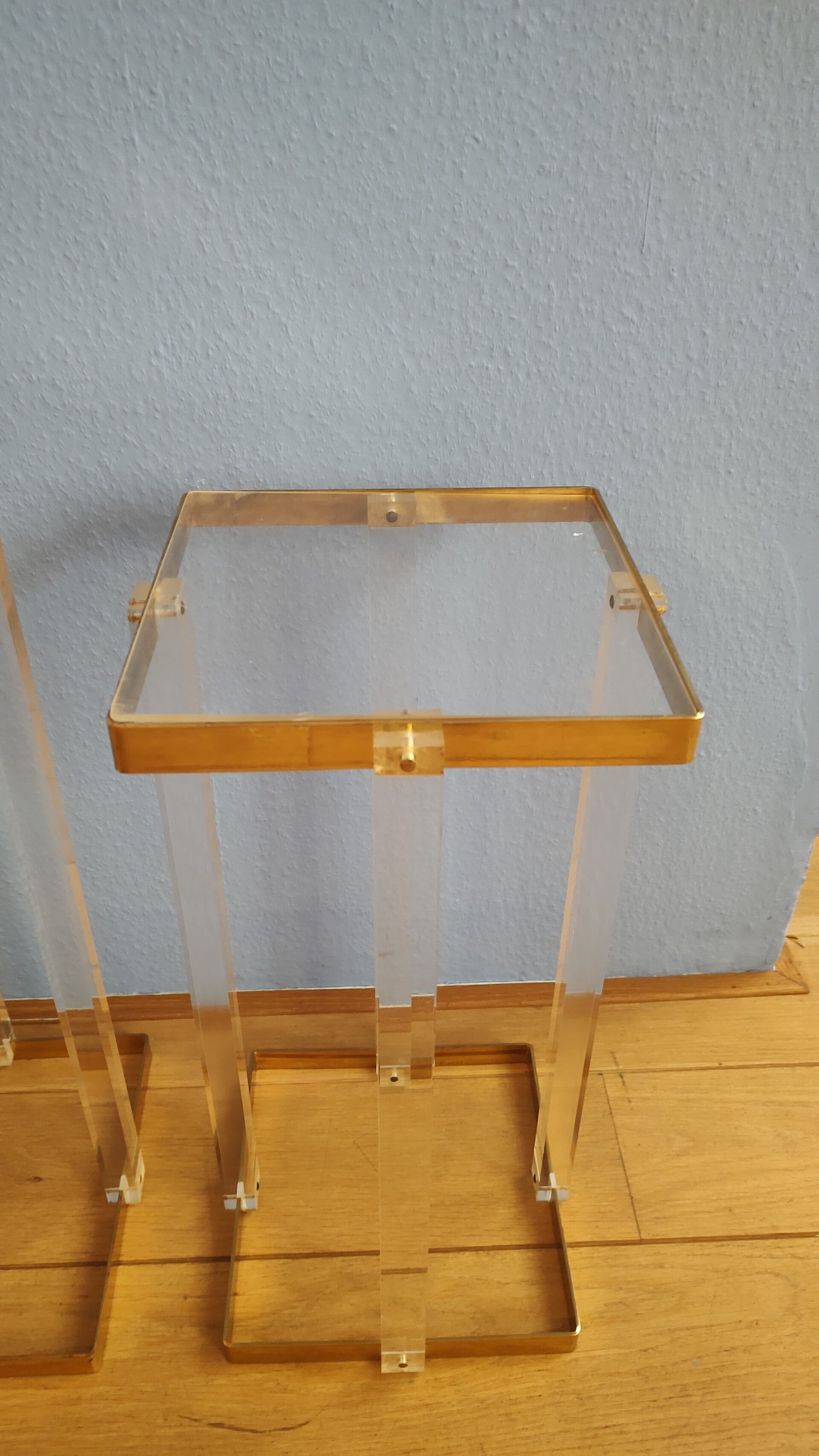 Chique and stylish set of 2 plant tables in brass and plexiglass from the 1970s