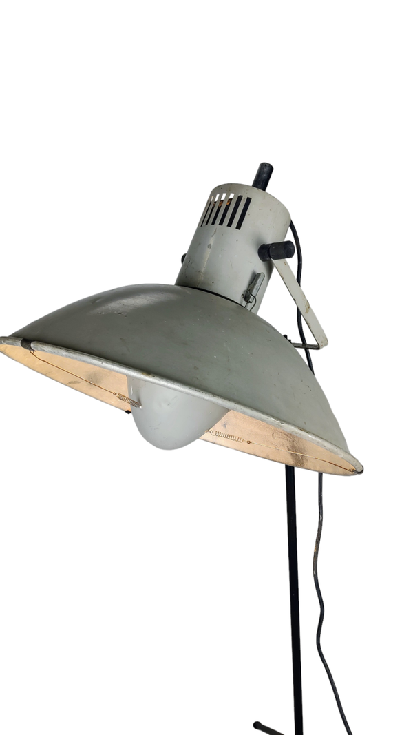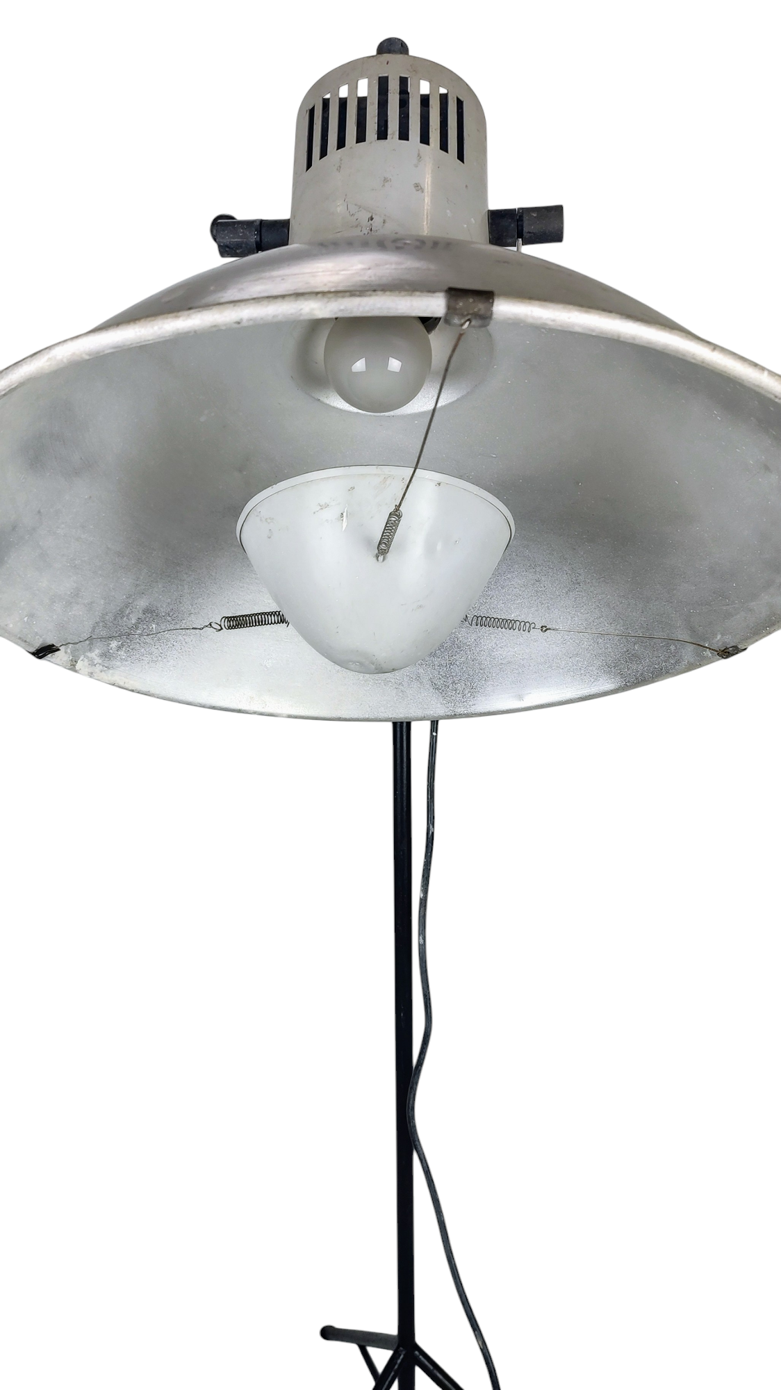 Industrial floor lamp with large shade (65cm) from the 1960s. Traces of usage that give the lamp a nice patina. Good working condition