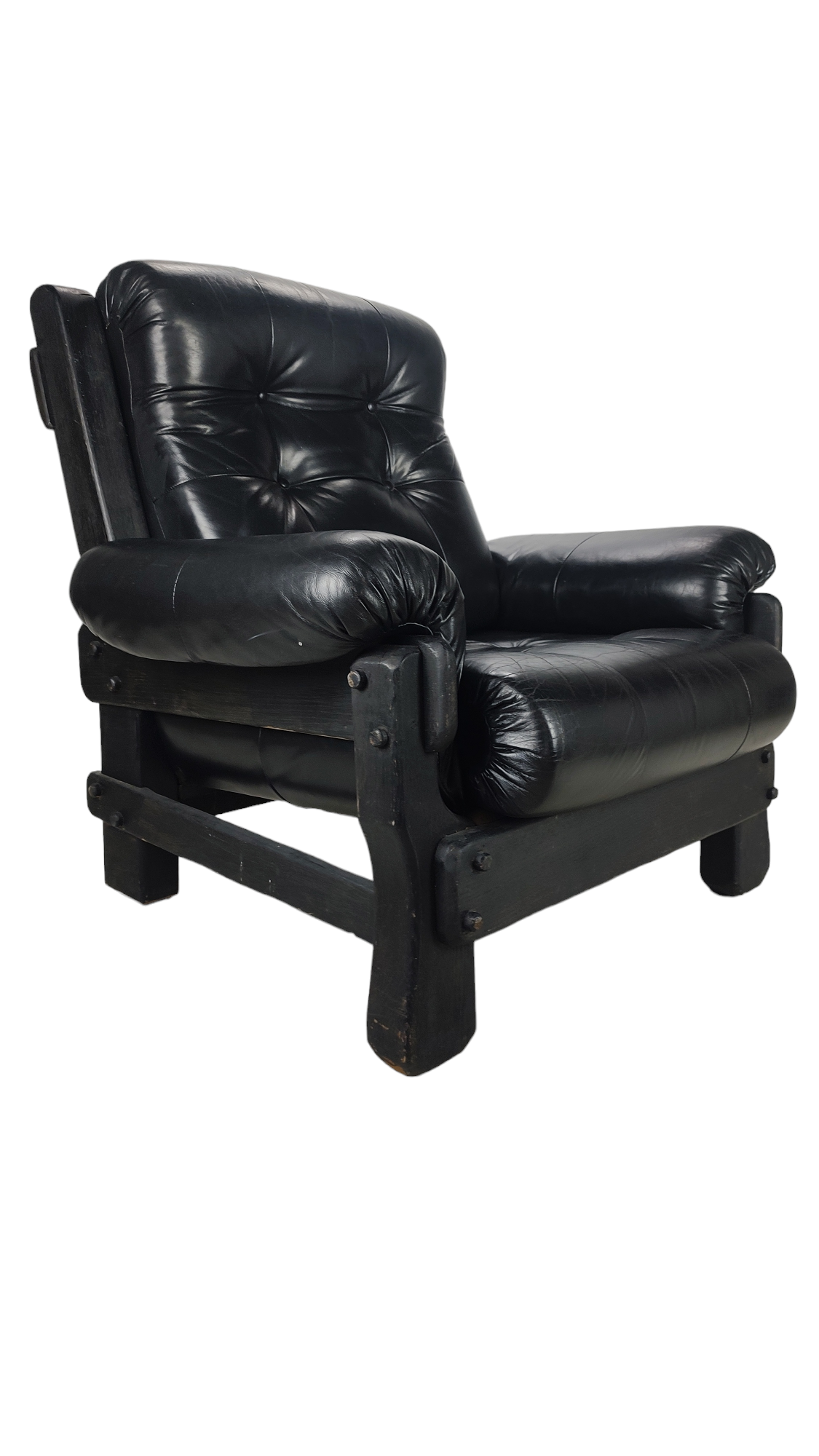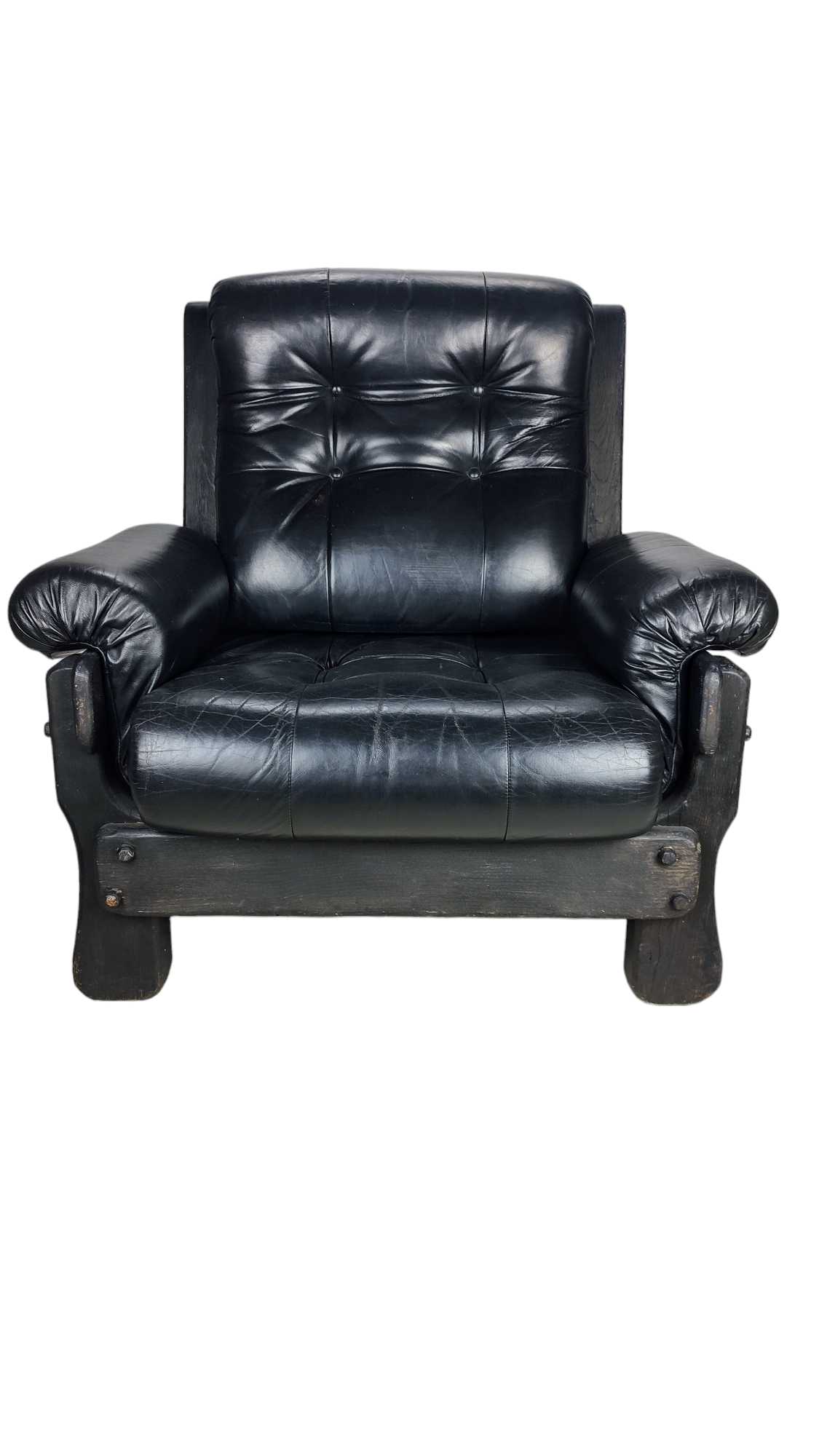 All black oak and leather Brutalist armchair from the 1970s. Some traces of usage on the leather and wood but overall in good vintage condition.