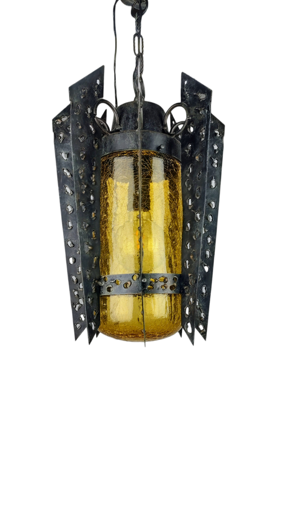 Cast Iron and yellow glass Brutalist pendant lamp from the 1970s. Capricious design
