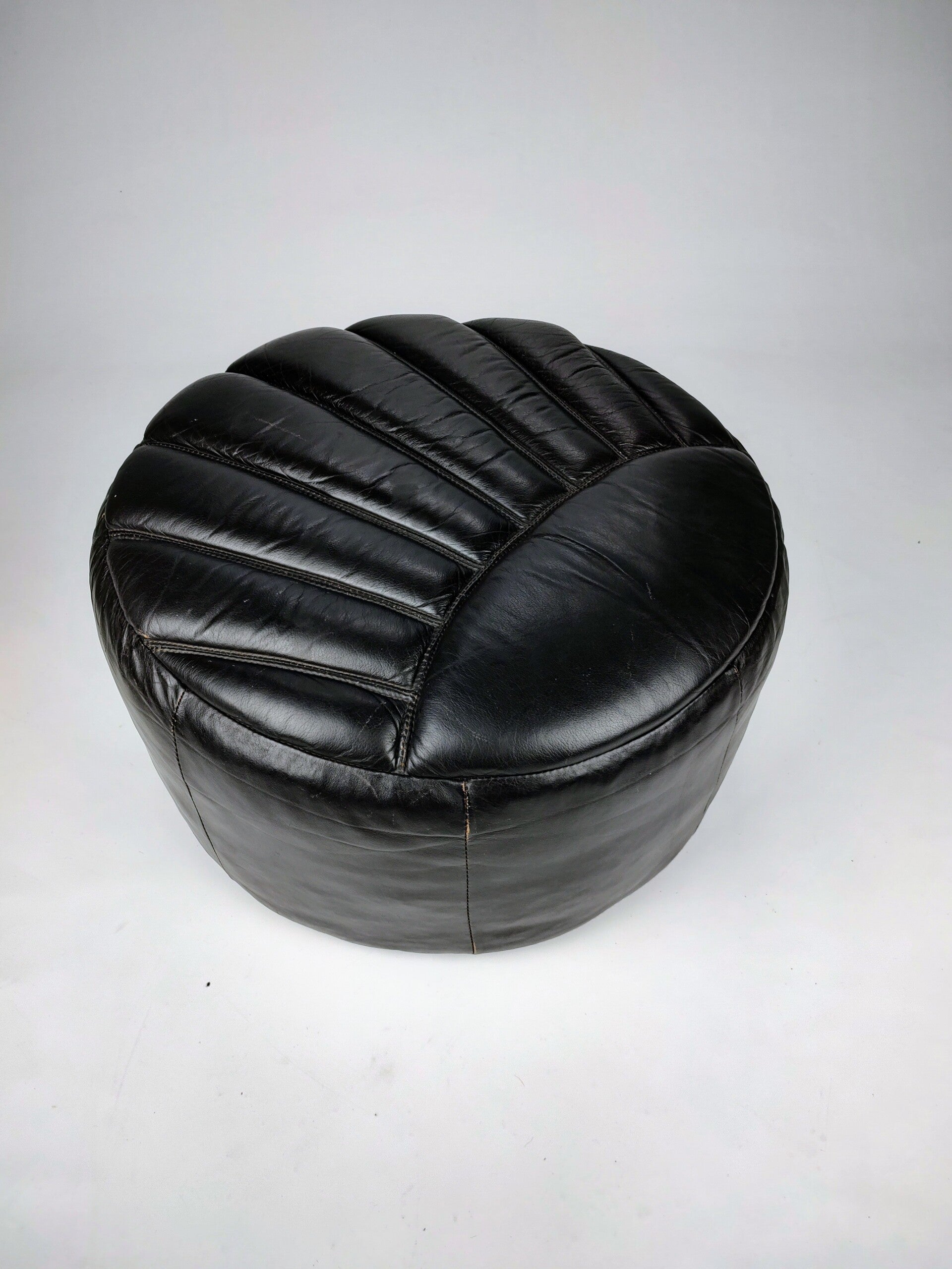Darkbrown (near black) leather footstool. Great pattern and very firm for sitting