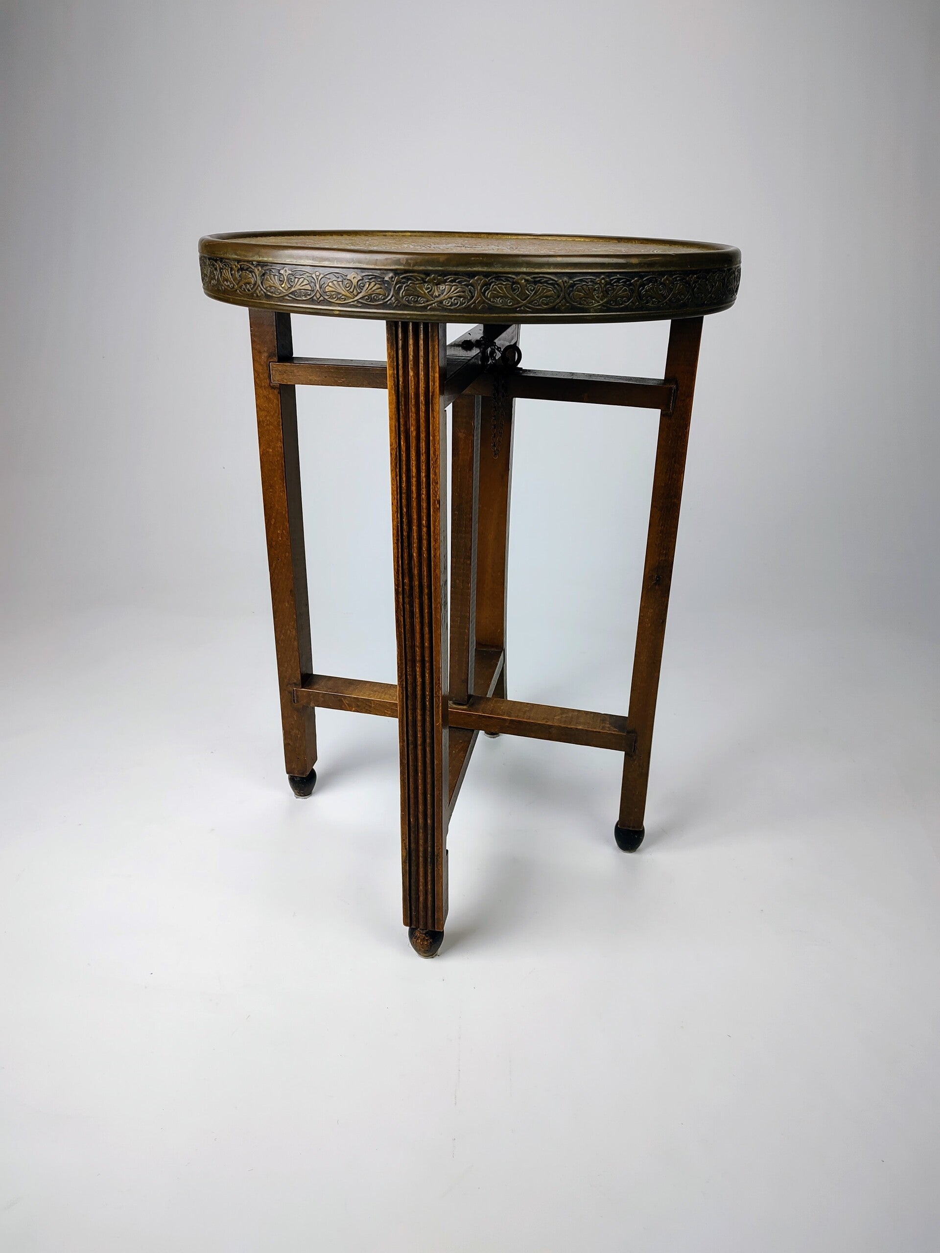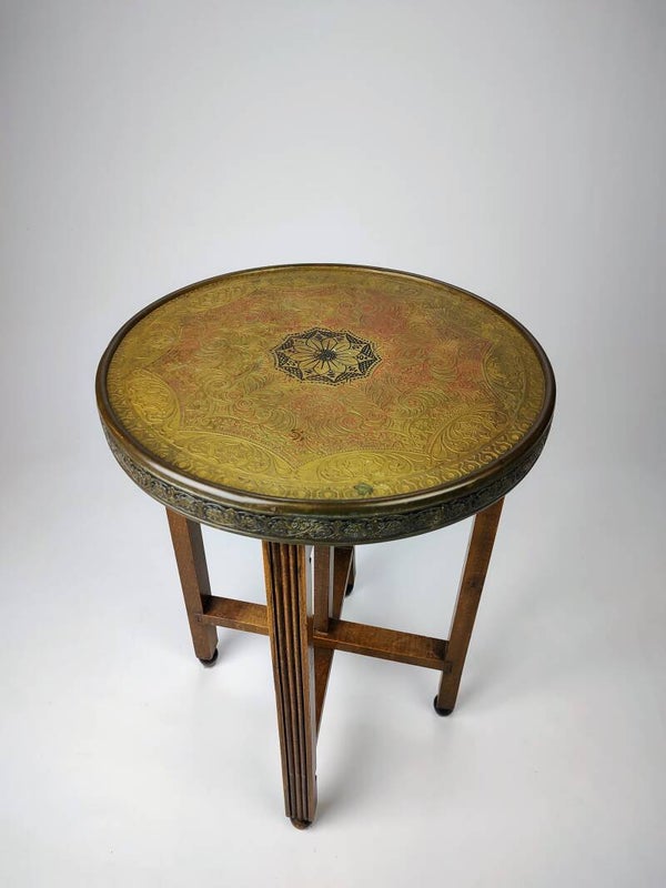 Great art-deco side table with brass top. Top was once painted. Traces of the old paint give a great patina